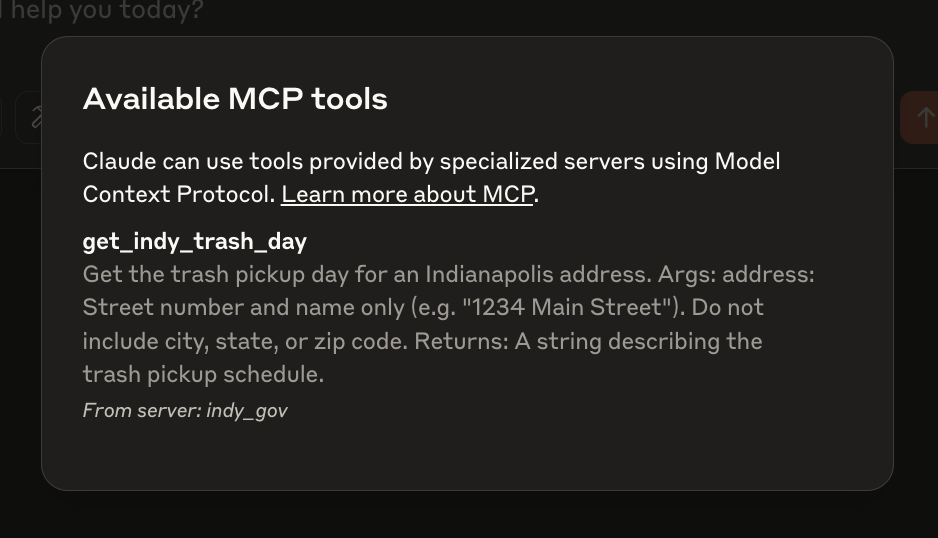 I decided to write a Model Context Protocol (MCP) server to interface with the indy.gov trash pickup app so I can look up my trash pickup day without the arduous burden of clicking three or four times.