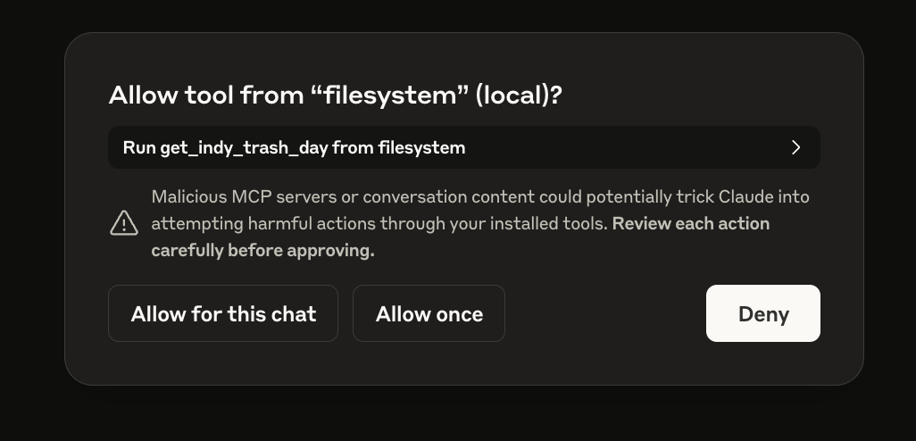 Once I clicked allow, Claude handed the MCP server my address and received a JSON response. Finally, it converted the JSON response to human-readable text and responded. I was able to follow up by asking what my next bulk pickup day is (something the indy.gov web app doesn't show).