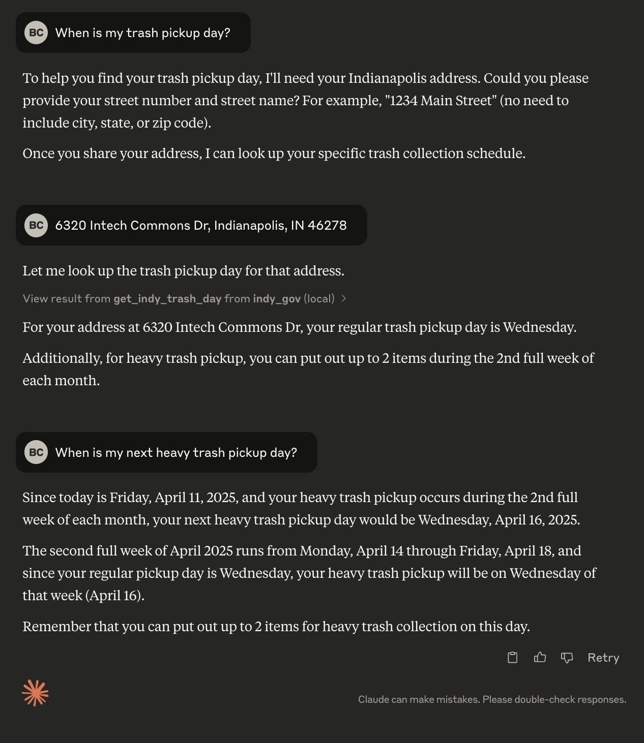 I built a Model Context Protocol (MCP) server that interfaces with Indianapolis's trash pickup website, allowing AI assistants like Claude to look up trash collection schedules with a simple prompt. This demonstrates how MCP can turn everyday web services into AI-accessible tools with minimal coding effort.